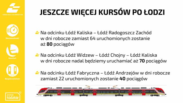 - Na odcinku Łódź Kaliska – Łódź Radogoszcz Zachód w dni robocze zamiast 64 uruchomionych zostanie aż 80 pociągów. Poprawi to możliwość przemieszczania się mieszkańców w granicach miasta