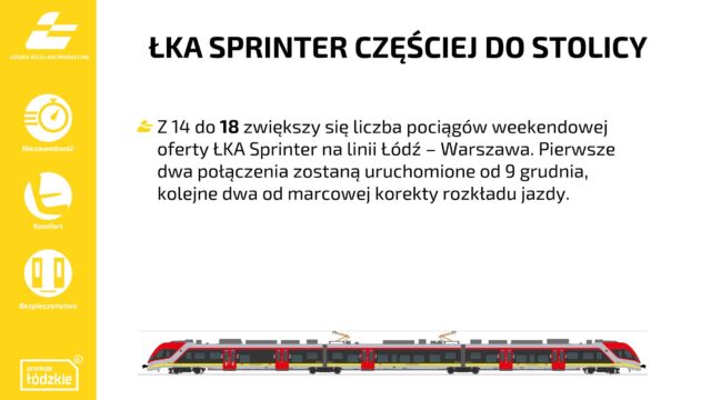 Z 14 do 18 zwiększy się liczba pociągów weekendowej oferty ŁKA Sprinter na linii Łódź – Warszawa. Pierwsze dwa połączenia zostaną uruchomione od 9 grudnia, kolejne dwa od marcowej korekty rozkładu jazdy.